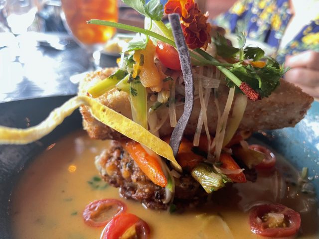 We’ve been on a dates kick ever since a May, 2021 visit to Mas Tapas Y Vino where über chef Marc Quiñones enthralled us with a dates plate that demonstrated a higher state of deliciousness. As someone with an aversion to overly sweet fruits, combining dates with savory ingredients has made a believer out of me. Similar to the dates at Mas Tapas Y Vino, the pairing of sweet and savory flavors on Desert Bistro’s baked bacon-wrapped dates (stuffed with chèvre and drizzled with pomegranate molasses) was an absolute winner. Bridget advised us to drench the dates into the coffee laced pomegranate molasses at the bottom of the plate. Great advice! Each bacon-wrapped date was like a nugget of pure gold, like a meat candy we couldn’t put down.
