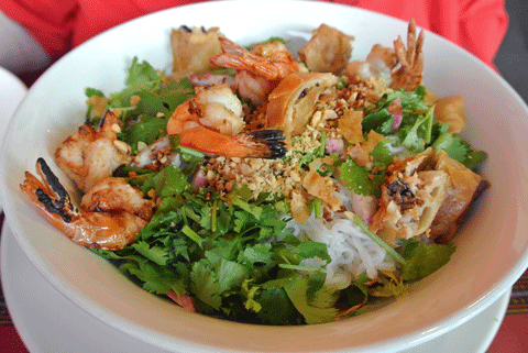 Thailand’s close geographical proximity to Vietnam has meant a culinary interchange over the generations that has resulted in cooks from both cultures being proficient in both cuisines. If the Vietnamese noodle bowl is any indication, you certainly need not fear ordering Vietnamese dishes at Krung Thai. Served in a swimming pool-sized bowl, this is a terrific dish redolent with freshness. A tangle of translucent rice noodles shares space with lettuce, cilantro, butterflied shrimp, pork skin, grilled pork, egg rolls, crushed peanuts and fish sauce. It’s a melange of flavors and textures you’ll enjoy.